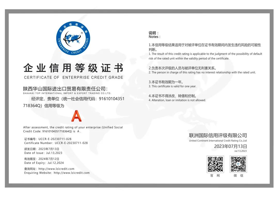 陕西华山国际进出口贸易有限责任公司评级结果公告