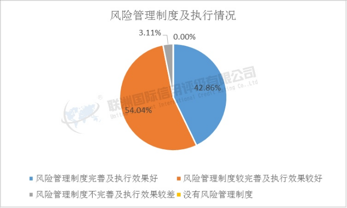 在风险管控制度及执行方面,有42.86%的公司风险管控制度完善,制定相关风险制度,风险管理流程贯穿于管理经营的各个环节;有54.04%的公司的风险管控制度较完善,制定相关风险制度,风险管理流程贯穿于管理经营的大部分环节;有3.11%的公司风险管控制度不完善,制定相关风险制度,风险管理流程贯穿于管理经营的小部分环节。