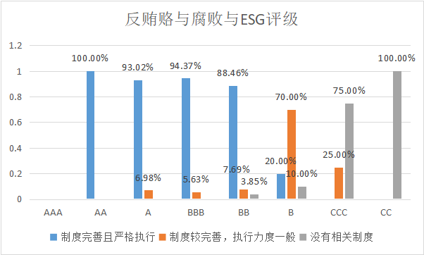 通过分析制药、生物科技和生命科学行业上市公司的ESG表现得出反贿赂与反腐败制度完善性及执行效果与ESG评级成正比。具体看,ESG评级越高,反贿赂与反腐败制度完善且严格执行的公司占比越高,评级为AA、A、BBB的公司,反贿赂与反腐败制度完善且严格执行的占比超过90%;ESG评级低的公司,没有制定相关反贿赂与反腐败制度的公司占比较高,评级结果为CCC和CC的公司,没有制定相关反贿赂与反腐败制度的占比超过75%。因此,该行业公司为了提高ESG评级,可以从反贿赂与反腐败建设入手,不断完善反贿赂与反腐败相关制度及执行流程,提升 ESG 表现,夯实可持续发展的根基。